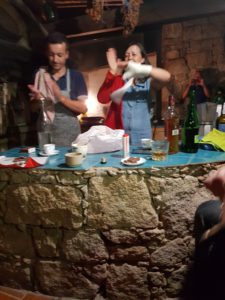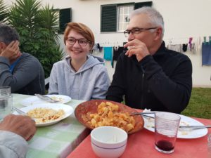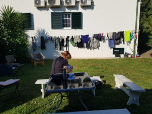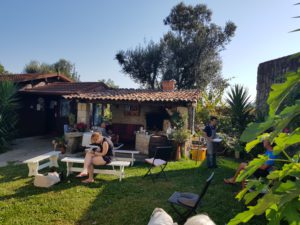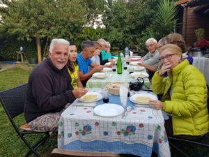 Als een Italiaanse familie in de tuin. Dit blijkt uniek te zijn want de dag ervoor is er een explosie in de keuken geweest waardoor er een complete puinhoop is onstaan en voor 20k aan schade. Fernanda heeft haar hand verwond en verontschuldigd zich dat we buiten moeten eten…wij zouden waarschijnlijk de groep pelgrims hebben gecanceld maar zij niet, iedere dag volle bak en altijd blij en relaxed, om een voorbeeld aan te nemen