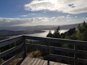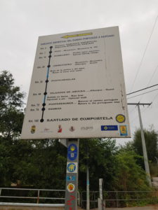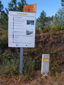 We lopen verder en wát een rust hier. Sinds eergisteren, vanaf Redondela is het druk, veel pelgrims onderweg. Hier komen de kustroute en de centrale route samen en hoe dichter bij Santiago, hoe meer routes bij elkaar komen. Door te kiezen voor deze variant, waarbij we een lus extra maken, merken we gelijk dat die druk(te) wegvalt. We genieten van ons meegenomen broodje en kijken naar de route van de komende dagen.