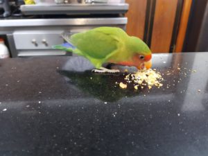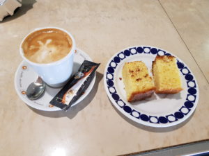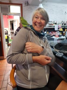 Tijdens een Caminho info café in Nederland is me verteld dat dit het mooiste deel van de Portugese route is. Ik ben dus heel benieuwd naar wat er komen gaat. Joan en ik drinken een kop koffie in een rustig cafeetje en de eigenaar laat zn vogeltje vrij uit de kooi. Het vliegt naar Joan hahaha en eet de kruimels die de man over de bar strooit.