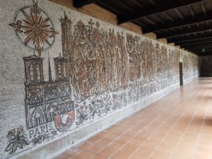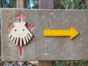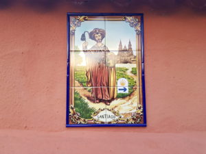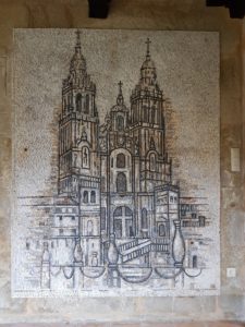 In het klooster krijg ik een stempel en koop een kaartje om binnen te kijken. Er is een enorm groot mozaïek op de wanden gemaakt van de Camino Frances , de route vanaf de Frans-Spaanse grens bij St. Jean-Pied-de-Port, ik blijf foto’s maken, wat gaaf! Ik Pamplona waar collega Marianne is geweest, van haar heb ik de schelp aan mn tas die inmiddels al vaak door Nederlandse pelgrims op de foto is gezet vanwege de mooie tekst die in Groningen bij het beginpunt staat. Ik zie ook een weegschaal, mn sterrenbeeld, die kiek ik ook even. Het Nederlandse stel loopt hier ook rond. We groeten elkaar en ik geniet nog even van het op mezelf zijn.