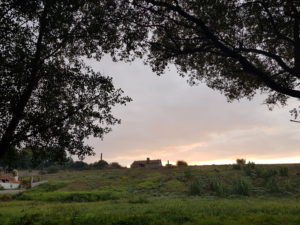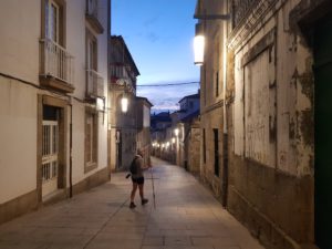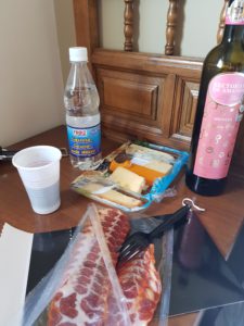 Ik heb lekker geslapen met mn oordoppen in en sta zachtjes op. Iedereen slaapt nog dus ik ben het eerst in de badkamer en grijp mn kans. Thuis wil ik nog wel eens starten in de badkamer , ontbijten en dan opnieuw naar de badkamer; tandenpoetsen, haar doen, lenzen in . Dat leer je hier wel af, is niet efficiënt en een plekje in de badkamer is gebruik maken van de badkamer, je hebt niet vanzelfsprekend een tweede kans. Ik pak mn ontbijt uit de koelkast en plotseling staat de gastvrouw achter me. Ze gaat op pantoffels en in een dikke badjas haar 3 kleine hondjes uitlaten. Ik schenk er geen aandacht aan verder. Ik heb ook een broodje gekocht en dat maak ik klaar voor onderweg. Als de gastvrouw terug is vaag ik of ik een kopje thee mag zetten. Joan denkt: o, aha, …dan vraag ik of ik een kopje koffie kan krijgen waarop zij de reactie krijgt dat het ‘not included ‘ is. Pardon??? Gedeelde slaapplaats , zonder ontbijt, veel gasten met 1 douche/toilet voor 20 euro en dan zeggen dat een kopje koffie not included is? Niet wat ik gewend ben op de Camino! En Joan was hier twéé nachten! Wat een verschil met de service van gisteren …heb mn brillen terug 😁😎. Ik zeg afscheid nemen en dóór.
