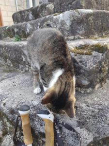 Het Nederlandse stel blijkt voor het ontbijt al vertrokken te zijn. Ik sla de hoek om en de klim begint gelijk al. Na een kwartier zie ik geen pijlen meer, huh? Weer afdalen dan maar….had ik al vrij snel naar rechts gemoeten maar ik keek teveel naar andere dingen. Een poes komt kijken wat ik doe en of ik iets lekkers heb.