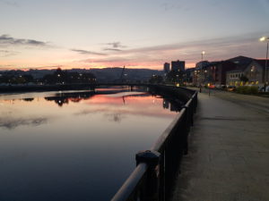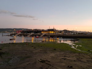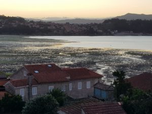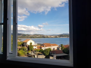 Het heeft wat gemiezerd terwijl ik binnen was, maar onder de bomen is de stoep nog droog. Het is daardoor heerlijk fris wandelweer. Wat voor dag is het vandaag? Zaterdag! Ook hier wordt gesport, ik schuil even voor een buitje tussen de voetbalouders, je ziet ze denken…. sommigen fluisteren even wat en ik vang ‘Santiago’ op tussen het onverstaanbare Spaans in Galicië. Ik lach vriendelijk en loop weer verder. Wat mooi hier, ik zie het water, ik denk rivier maar het blijkt de zee inclusief en eb en vloed ontdek ik later. Daar is Combarro al, ik ben er om 13 uur en check in. Aardig mannetje dat geen woord over de grens spreekt. Mijn kamer heeft een uitzicht uit een vakantieboek, wat ontzettend gaaf (roep ik een keer of 30). De badkamer heeft een bad waar alleen hele kleine mensen in kunnen liggen, ik pas óók met de benen rechtomhoog tegen de muur. Er is een wasmachine en mijn was mag er in. Ik ga een uurtje slapen (Oh wat knap je daar van op!) Hang de was op het dakterras en maak een praatje met een Engels stel dat hier een maand door noord Spanje rondreist. Het vissersplaatsje is echt heel mooi en ik trakteer mezelf op een wijntje, kaasjes en chips, het is immers zaterdagavond. Je kunt hier pas laat eten en daar wil ik niet op wachten. Een feestje op mn kamer met een view! Ik zing Happy van Farell Williams omdat ik het ben.