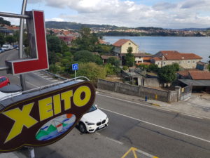 Ik schrijf nog wat voordat ik ga slapen en de volgende ochtend, ik loop net gedoucht in mijn ondergoed, klopt de hoteleigenaar op de deur: Christina! Spaans druk gepraat.. mucheiro…oh het vervoer voor mn rugzak is er al, meer dan een half uur eerder dan gezegd. Dat was me nog een grappige spraakverwarring gisteren. Bianca tipte me om voor 1x mezelf een lol te doen en de zware rugzak naar haar huis te laten brengen en alleen mezelf en een tasje voor overdag de berg op te laten lopen. G oord plan. Vraag het maar in het hotel, komt wel goed. De beste man begreep vlot wat ik wilde maar nee mn tas moet niet naar het klooster maar naar het adres van Bianca. Ik laat hem het berichtje van Bianca op mijn telefoon lezen: Ons adres, Valboa 25 Armenteira Meis. Hij knikt en gaat bellen…blablavla ons adres…bla bla in superrap Spaans. Moeilijk gezicht en een groot vraagteken elke keer wanneer hij ‘ons adres’ zegt. Hij vraagt kennelijk rond of iemand een overnachtingsplaats kent met de naam Ons adres. Oh help, met handen en voeten, in het Engels Frans en mn beste Spaans, snapt hij niet waar ik denk te gaan slapen. Ook best hilarisch. Ik geef hem het telefoonnummer en hij belt op: spreek ik met Ons adres? Si, si….si….si… peregrina Christina de Hollanda,….si…ah muy bueno….si komt dus helemaal goed, half 9 ontbijt en tas mee naar beneden, wordt hij om 9 uur opgehaald. Dat bleek dus 8 uur.
