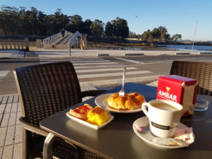 Was afhalen, alles weer geordend in de tas, ik laat mijn rugzak nog even achter op mijn kamer (deur met cijferslot, wat een luxe) en ga het mooie vissersplaatsje in, het ruikt naar vis hier, beetje Urk maar dan anders. Ik wil even uitzoeken hoe dat zit met het behalen van een Pedronia in Padron, waar ik een berichtje van Luisa uit Nederland (Camino Comfort) over kreeg. Eerst koffie met een croissantje op het terras tegenover de brug. Ik krijg er een broodje jam en een stukje cake bij, lekker! Dit stukje lopen lijkt vanmorgen een stuk korter dan gisteren. Het is heel lekker weer, niet te heet, gewoon lekker vakantieweer en zo voelt het ook nu ik deze ochtend “vrij” ben.