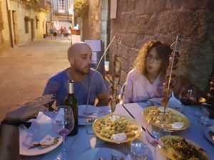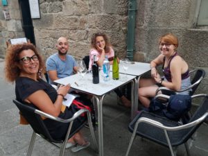 Éénmaal gedoucht ben ik weer een ander mens. Savonds gaan we Spaans eten om de hoek samen met Bruno, Ana en Ruth uit Portugal die we hebben leren kennen in Ninho. De wijn vloeit, het eten is héérlijk (laat de keuze maar aan Ruth over) en we hebben gelachen om de zin en onzin van de Camino.